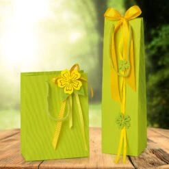 Schöne Flaschenbeutel aus stabilem Kraftpapier mit einer Streifenprägung in limette. Perfekt als Geschenktasche zum Verpacken für 1 Flasche Bocksbeutel oder 3 Piccolo. Die Flaschentaschen sind schnell zu befüllen und haben eine Tragekordel aus Baumwolle. Diese Taschen können natürlich genauso für andere Geschenke wie Delikatessen, Parfümerieprodukte und viele andere Geschenkartikel eingesetzt werden. Diese Flaschentüten aus Kraftpapier gibt es in vielen verschiedenen Farben.