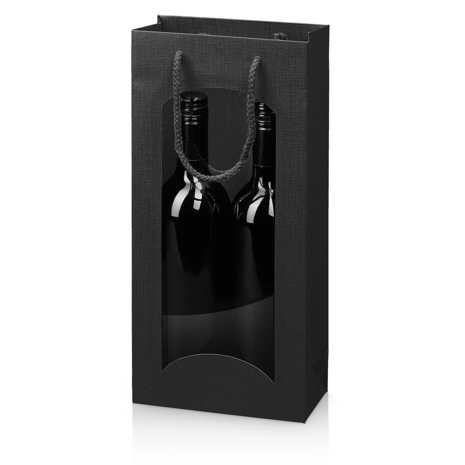Elegante Tragetasche für 2 Flaschen Wein/Sekt oder andere Geschenkideen mit besonderer Haptik durch Prägung in Leinenstruktur. Mit unseren Flaschentaschen stehen Ihnen preiswerte und edle Verpackungsmöglichkeiten zur Verfügung. Diese Tragetaschen sind durch die hohe Papierqualität stabil und verfügen über ein eingeklebtes Sichtfenster das gleich den Inhalt zeigt.