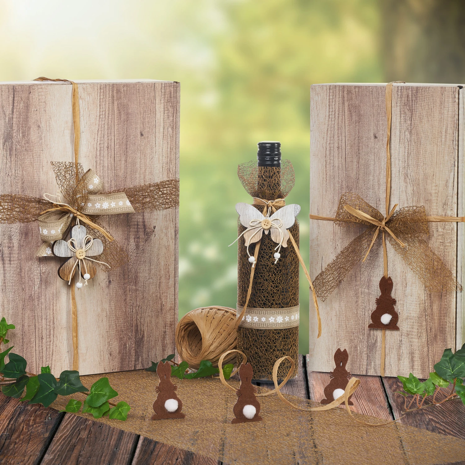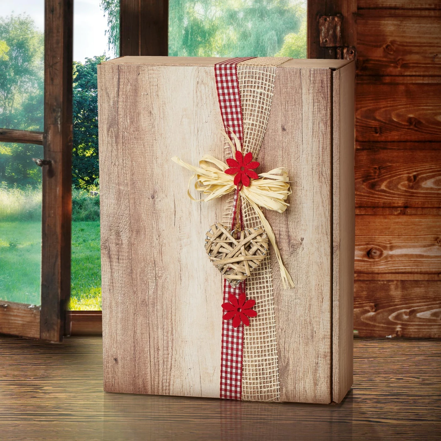 Dieser hochwertigen Flaschengeschenkkartons mit Motivdruck in naturgetreuer Holzoptik aus Karton ist die perfekte Geschenkverpackung für drei Flaschen Wein oder Sekt für eine Länge bis 360 mm. Der Offsetdruck mit Mattlack sorgt für eine entsprechende Haptik des Flaschengeschenkkartons. Die Innenseite und die Einlage vom Weinpräsentkarton ist in Naturbraun. Die Präsentkartons haben eine separate Flascheneinlage, welche die Flaschen voneinander trennen. Damit können die Flaschen beim Transport nicht gegeneinander schlagen und zu Bruch gehen. Dieser Geschenkkarton ist auch bestens für alle anderen Geschenke geeignet. Einfach die Flascheneinlage weglassen und schon haben Sie einen perfekten Geschenkkarton mit viel Platz für viele Produkte. Mit dem passenden DU-LOG Versandkartons sind die Weinpräsentkartons PTZ-Postgeprüft / DHL-Certified. Somit kommt Ihr Inhalt auch sicher beim Beschenkten an. Durch vorgestanzte, aufstellbare Ecken lässt sich der Innenraum auf verschiedene Flaschenlängen einstellen.