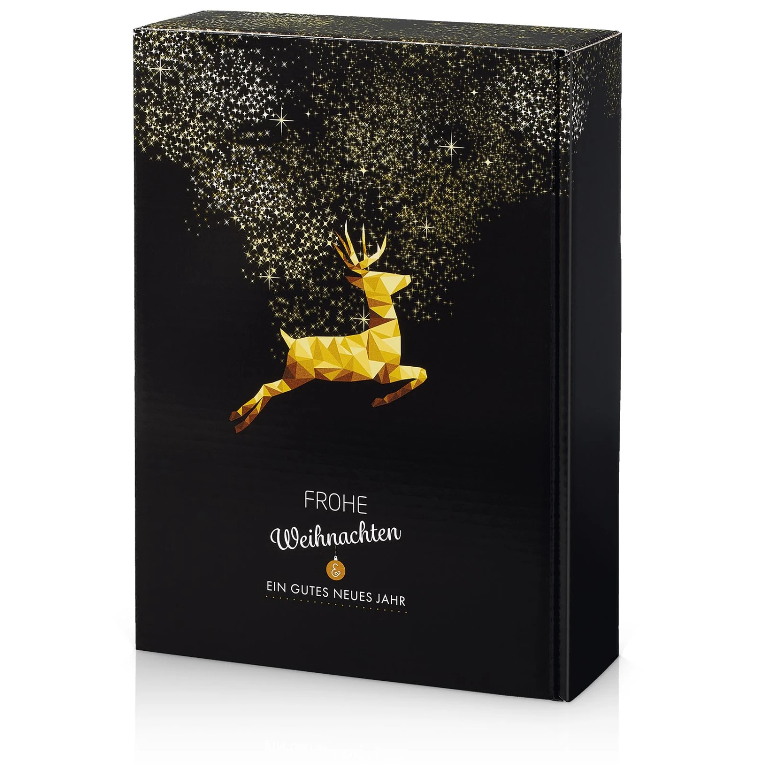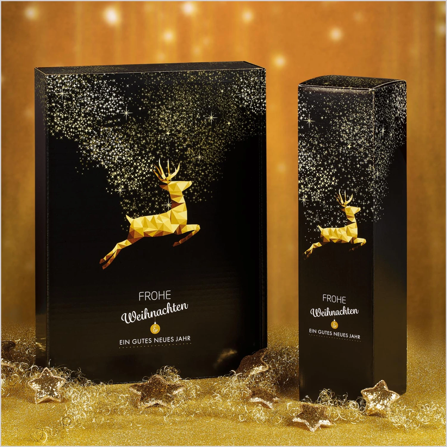 Präsentkartons für drei Flaschen Wein oder Sekt bis 360 mm Länge. Der Weinpräsentkarton mit Motivdruck Weihnachten Goldhirsch hat eine edle Optik. Die Innenseite sowie die separate Einlage sind in Schwarz. Mit dem passenden DU-LOG Versandkarton sind Präsentkartons PTZ-Postgeprüft / DHL-Certified. Somit kommt Ihr Inhalt auch sicher bei Ihren Kunden an.