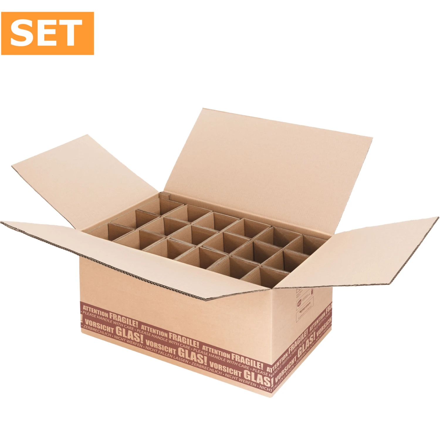 Die Flaschenversandkartons für den stehenden Versand von achtzehn Flaschen Wein oder Sekt mit einer Länge bis 360 mm und 90 mm Durchmesser sind Flaschenverpackungen vom System S-LOG 360 und nach den neuesten Richtlinien für DHL PTZ (Post Technisch Zugelassen) geprüft. Die optimierten Flaschenverpackungen für den Versand wurde ebenfalls von Hermes zugelassen und von UPS zertifiziert. Die Flaschenversandkartons passend für achtzehn Flaschen verfügen über eine Einlage mit getrennten Gefache was ein aneinander schlagen der Flaschen beim Transport verhindert. Der stabile Karton aus brauner Welle garantiert einen sicheren Versand. Ein Warnhinweis in verschiedenen Sprachen für einen achtsameren Umgang beim Versand mit den Flaschenversandkartons ist bereits aufgedruckt, so spart man sich beim Verpacken auch das Klebeband mit dem Hinweis Vorsicht Glas!