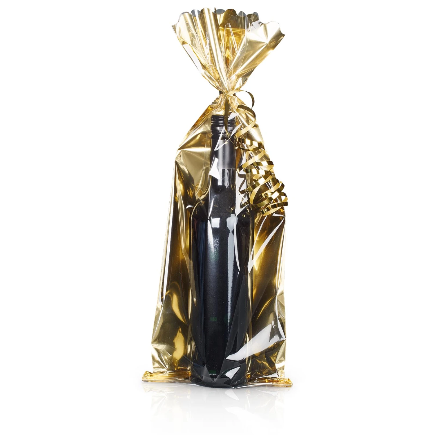 Schöner Flaschenbeutel aus stabiler und transparenter Geschenkfolie mit farbiger Rückseite in Gold metallic. Perfekt als Geschenkverpackung zum Verpacken für Wein und Sekt Flaschen. Die Flaschenbeutel sind schnell zu befüllen und mit einem Geschenkband oder Geschenkschleife einfach zu verschließen. Die Geschenkfolienbeutel können natürlich genauso für andere Geschenke wie Delikatessen, Parfümerieprodukte und viele andere Geschenkartikel eingesetzt werden.