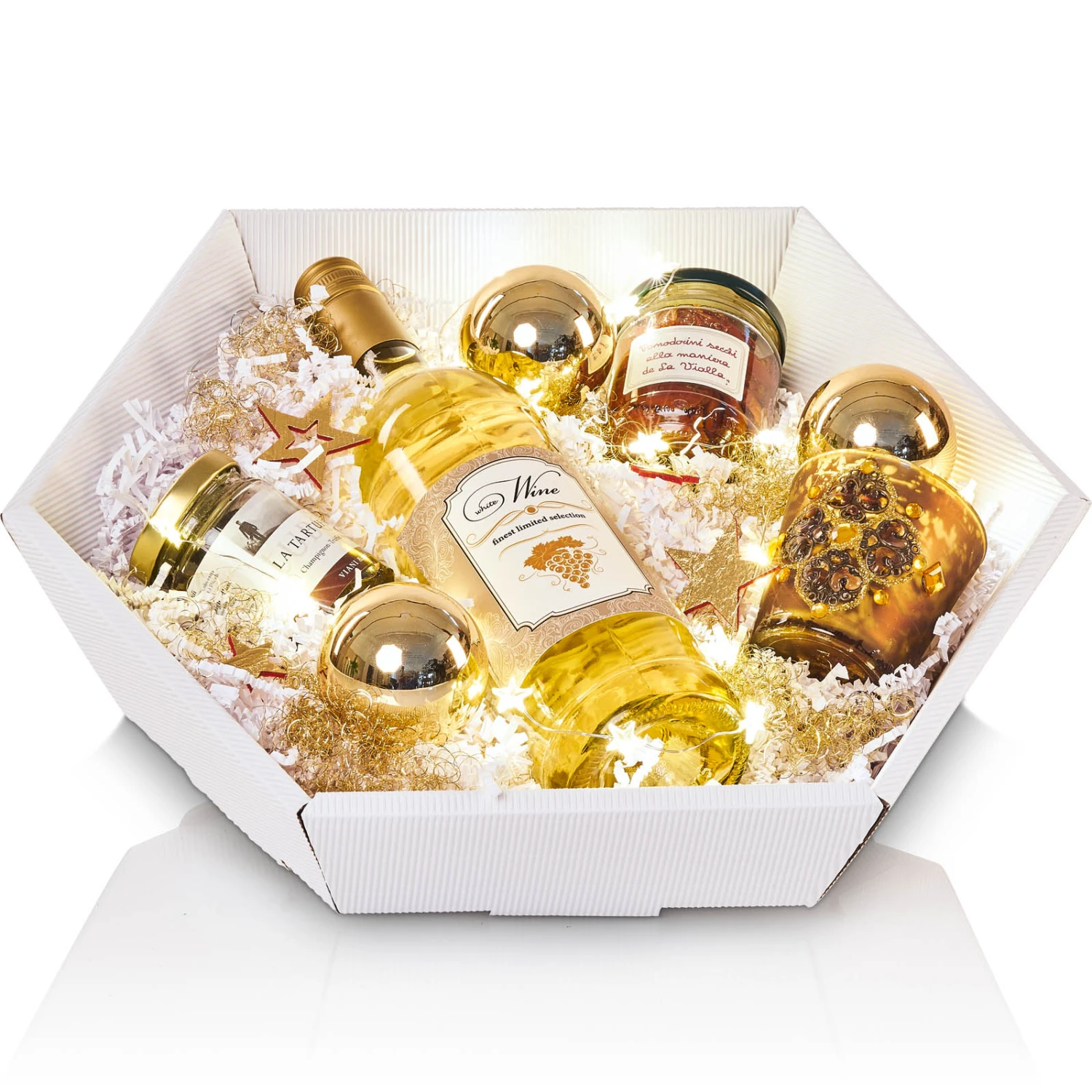 Kombinieren Sie das Englshaar mit unserem farbigen Füllmaterial PresentFill um edle und glänzende Akzente zu setzen. Passend zu unseren Geschenkkörben, Präsentkartons oder Holzkisten.