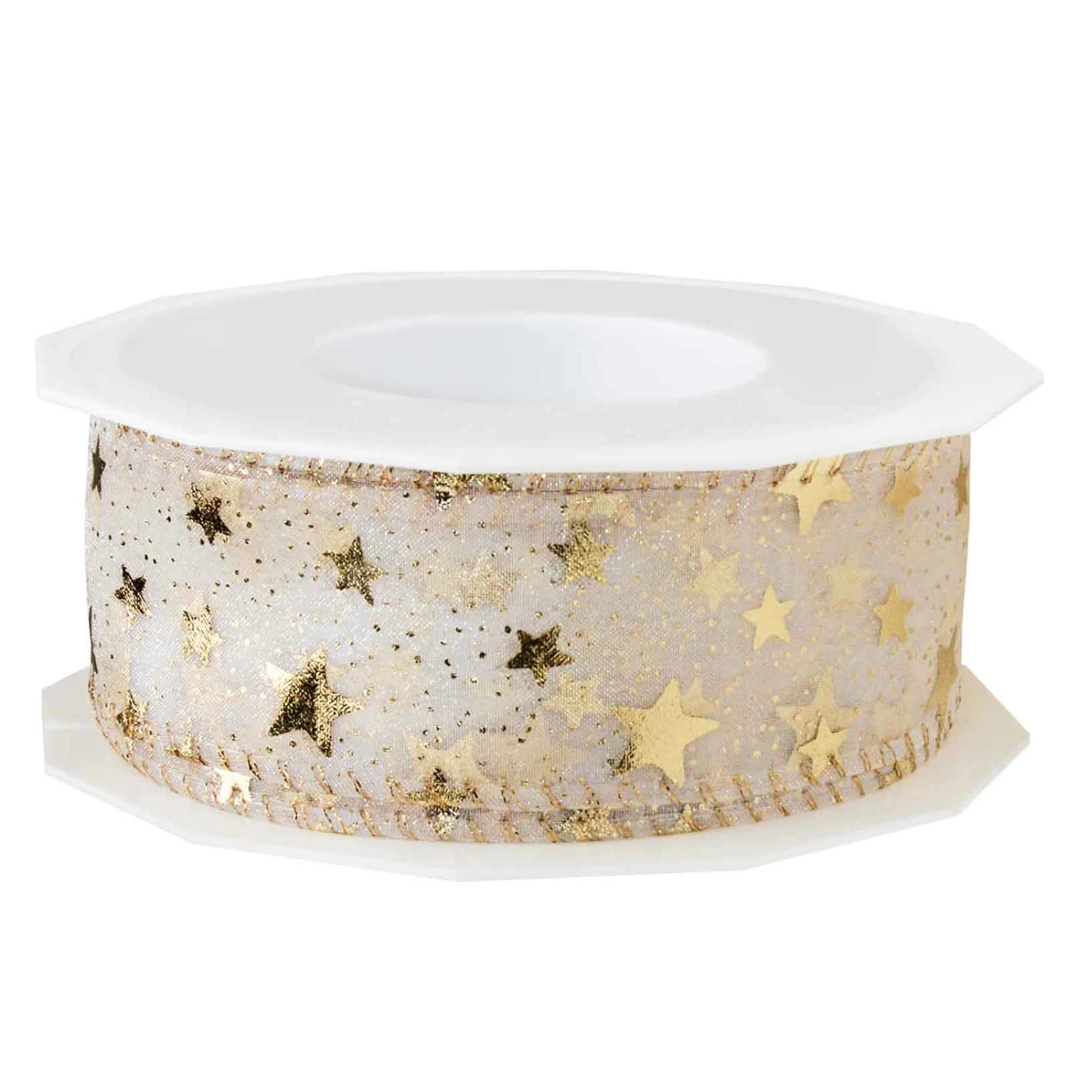 Zartes, cremefarbenes Organzaband mit Drahtkante und goldenem Sternendruck