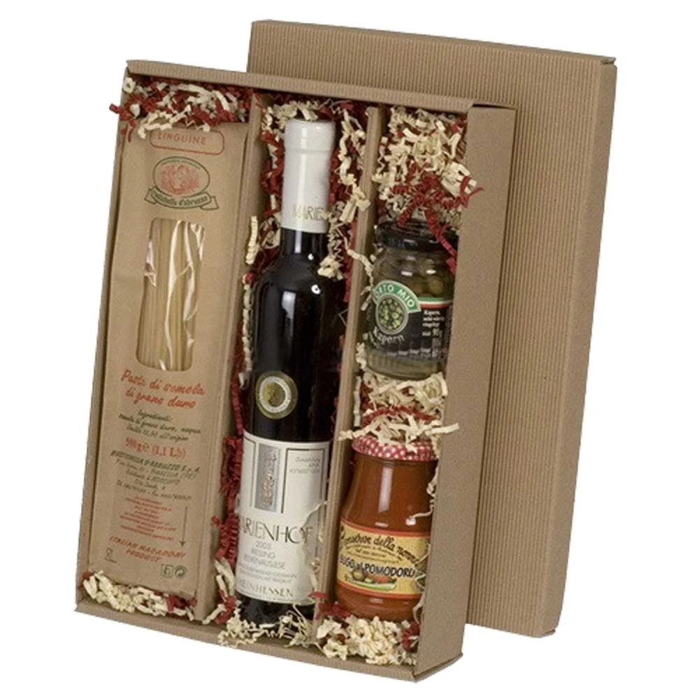 Die Box besteht aus Deckel , Unterteil und separaten Einlagen. Als Polster- oder Füllmaterial empfehlen wir unser farbiges PresentFill oder Holzwolle.