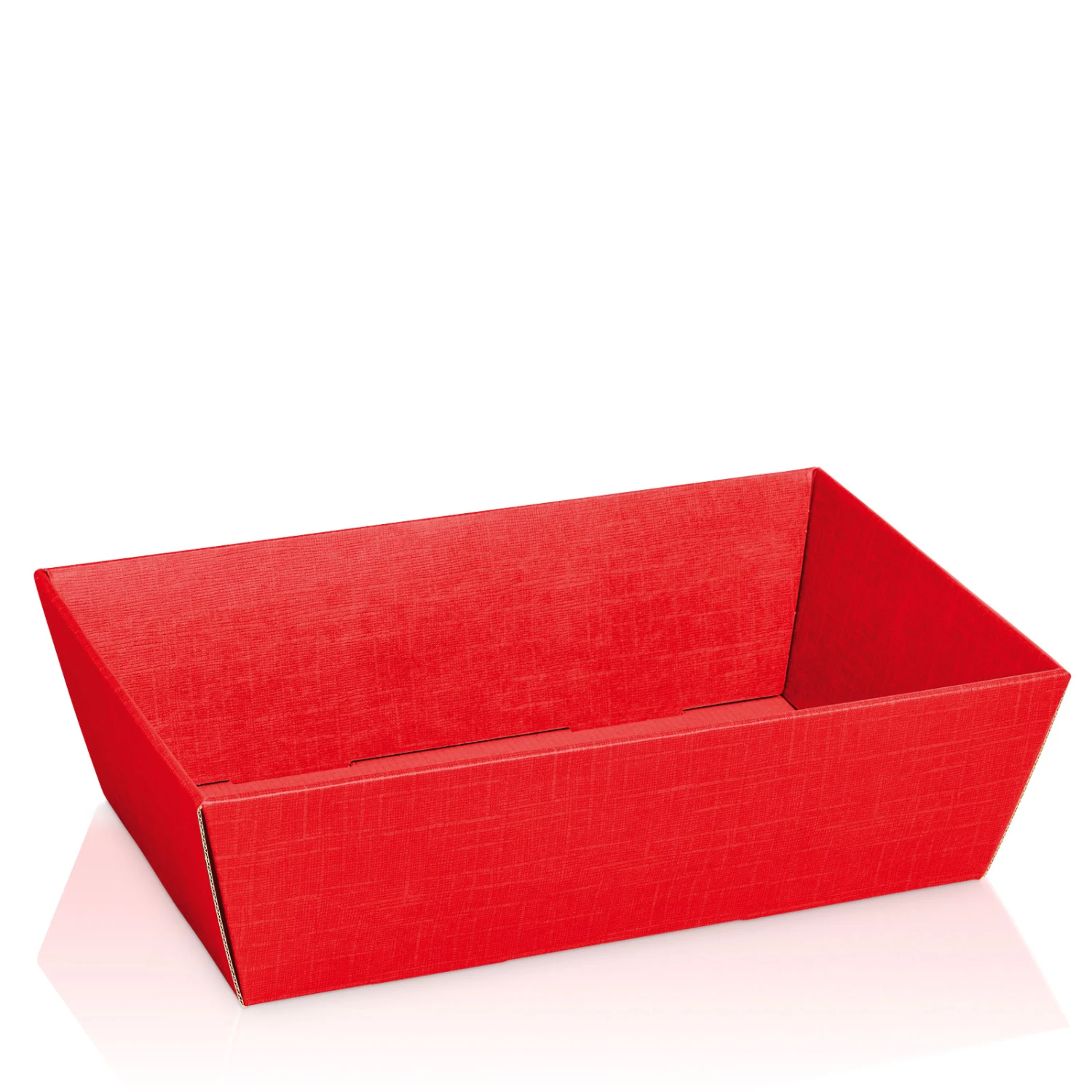 Diese viereckigen Geschenkkörbe haben eine Oberfläche mit Prägung in Leinenstruktur in der Farbe Rot. Die Innenseite ist in der gleichen Farbe wie die Außenseite. Die Präsentkörbe werden flachliegend angeliefert und sparen somit viel Lagerplatz. Der Geschenkkorb aus Karton ist sehr schnell aufgebaut und eignet sich hervorragend zum Verpacken und Präsentieren der unterschiedlichsten Produkte. Zum Auspolstern und Schutz der Geschenke im Präsentkorb eignet sich sehr gut Deko Fülllmaterial wie PresentFill oder Holzwolle.