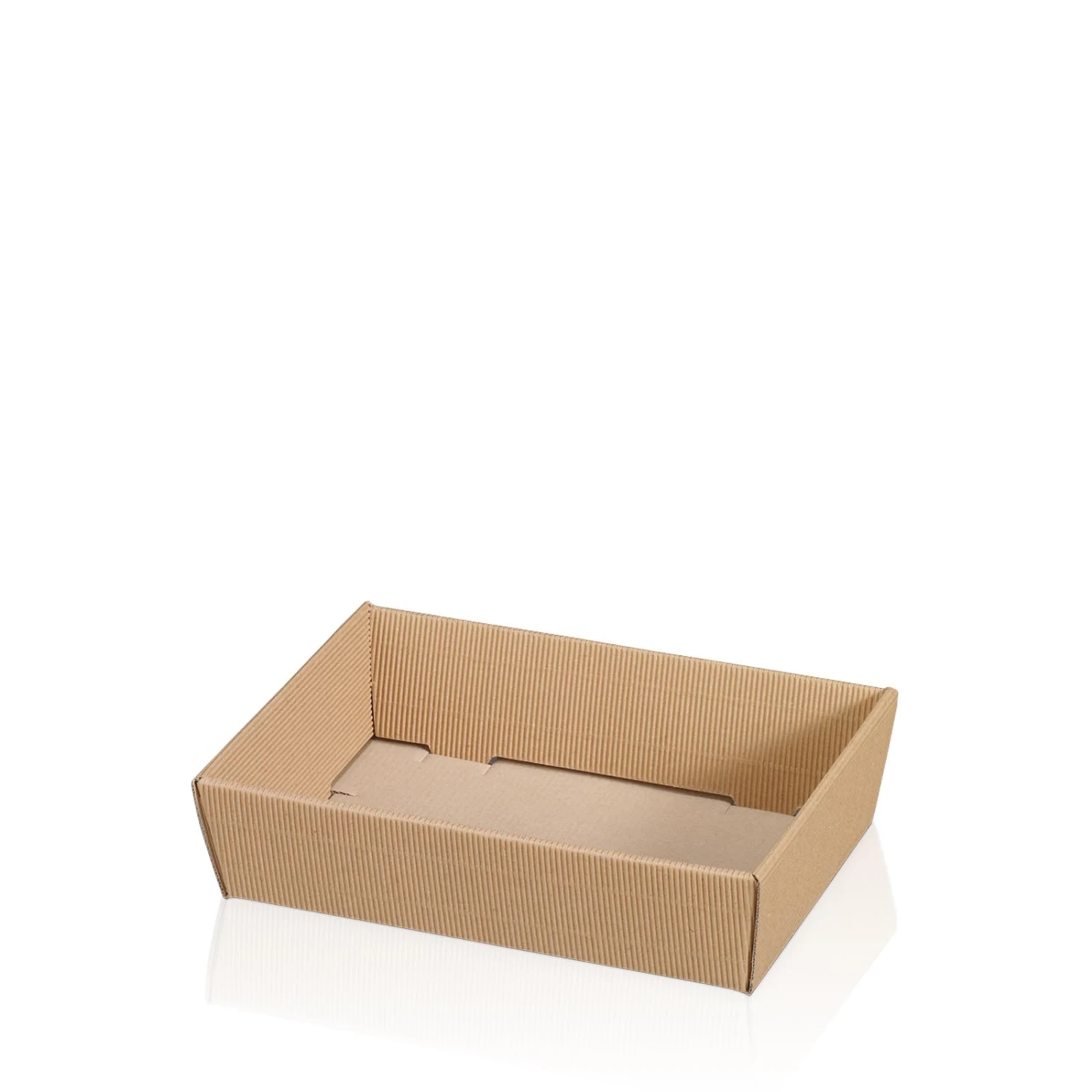 Viereckige flache Präsentkörbe aus offener Welle Karton in der Farbe Natur.