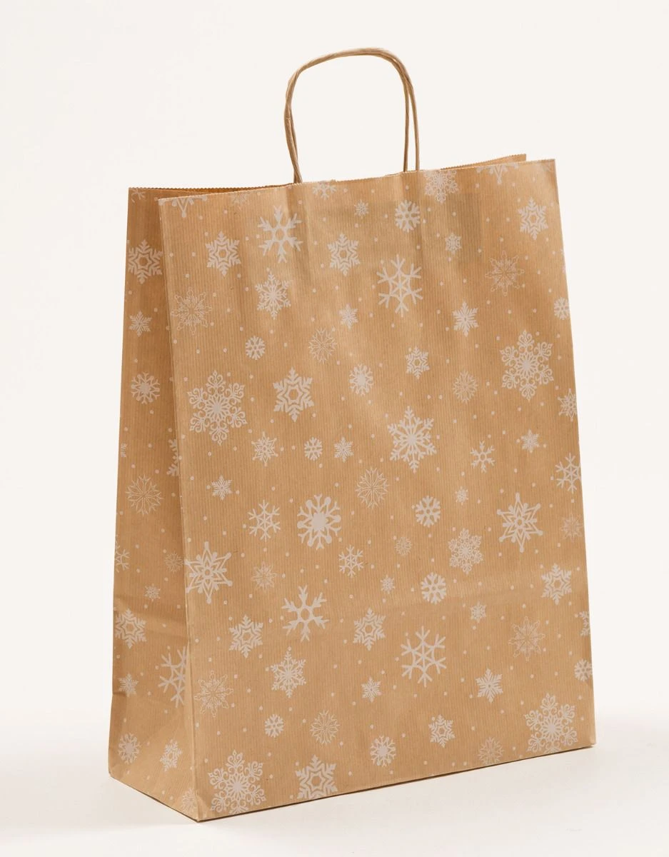 Papiertragetaschen mit Kordelgriff und weihnachtlichem Motivdruck Schnee. Das Format der Papiertüten ist 32 x 12 x 41 cm. Die bedruckten Tragetaschen aus braunem, geripptem Kraftpapier sind in einer Materialstärke der Papiergrammatur von 100 gr. hergestellt und bestens verarbeitet. Die stabilen Papiertragetaschen bieten sich als Shopperbag und Geschenktaschen für alle Bereiche an. Die Tragegriffe der Papiertaschen sind feste Kordelgriffe und bieten einen sicheren und stabilen Tragekomfort.