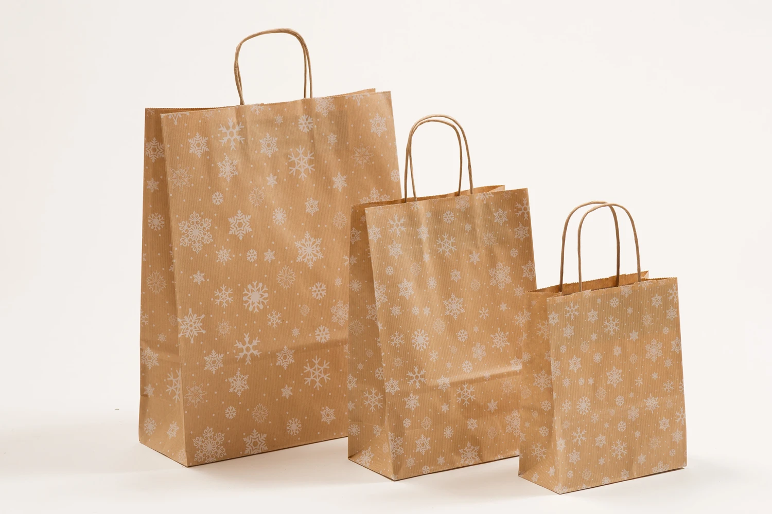 Besonders beliebt sind diese preisgünstigen Papiertragetaschen im Verkauf und Handel in der Weihnachtszeit zum schnellen und perfekten Verpacken für Waren und Produkte aller Art zur Mitnahme. Diese Tragetaschen aus braunem Kraftpapier mit dem schönem Design bedruckt gibt es in drei verschiedenen Größen.