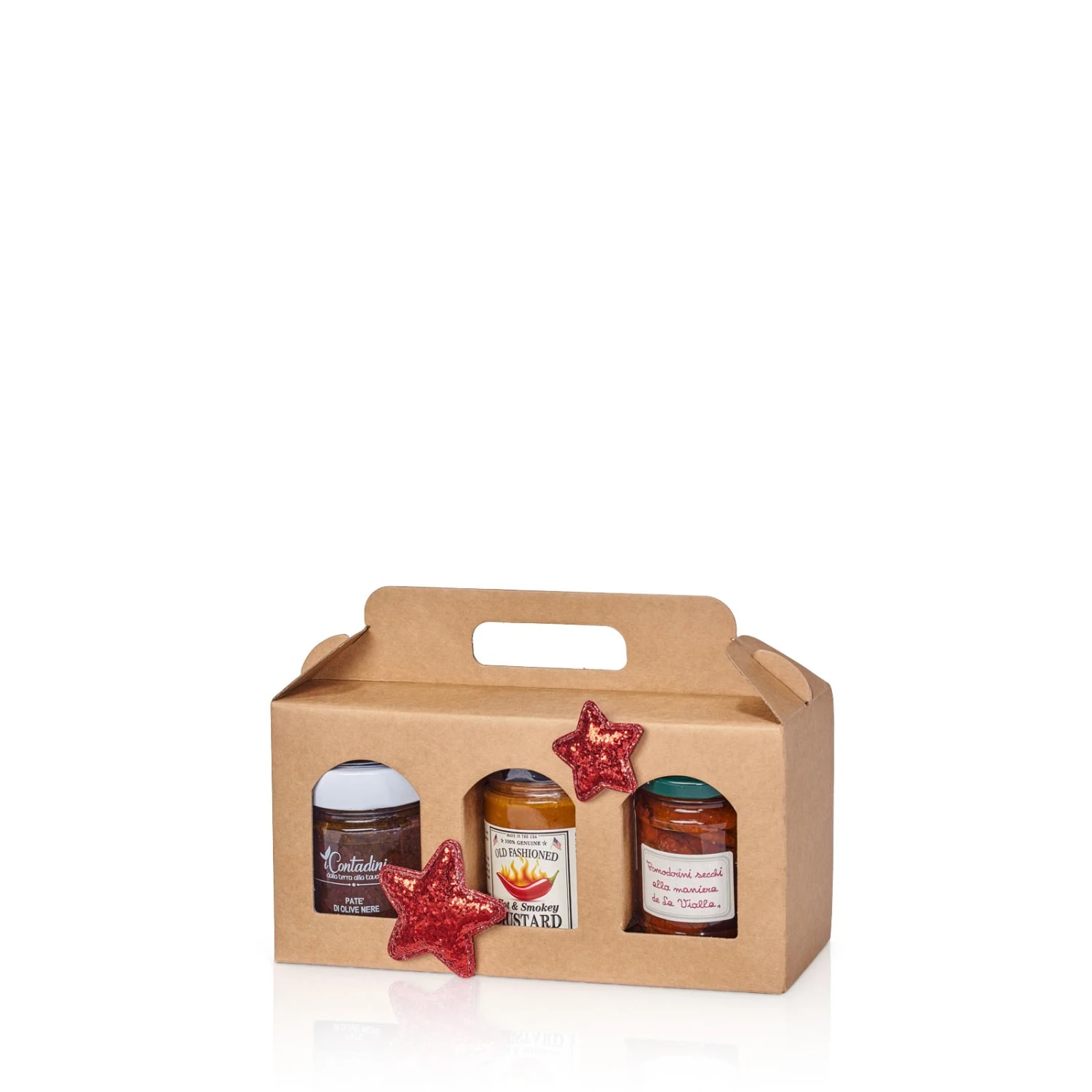 Tragekartons aus Wellpappe mit einer Kraftpapieroberfläche. Besonders geeignet für Marmelade, Senf, Pesto, Antipasti …. bis 120mm Höhe. Diese stabilen Tragekartons haben einen angearbeiteten Tragegriff und verfügen über einen vorgeklebten Automatikboden. Sie sind schnell aufgerichtet. Die eingeklappten Fensterausstanzungen trennen den Inhalt voneinander und ermöglichen den Blick auf den Inhalt. Bitte beachten Sie, dass Tragekartons immer von oben befüllt werden und nicht für den Versand geeignet sind.