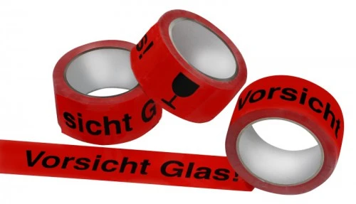 Warndruck Packband – Vorsicht Glas – weist auf einen empfindlichen Inhalt des Packstücks hin und mindert Transportschäden. Unser Topseller „Vorsicht Glas“ unter den Klebebändern mit Warndruck in leuchtend roter Farbe mit schwarzem Aufruck verfügt.