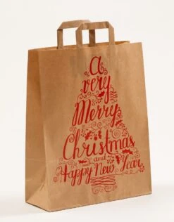 Diese Papiertragetaschen mit Innenflachhenkel besitzen einen einen Motivdruck in Form eines Weihnachtsbaumes in dem sich der Schriftzug „a very Merry Christmas and Happy New Year in Rot befindet. Das Format der Papiertüten ist 32 x 12 x 40 cm. Die bedruckten Tragetaschen aus braunem Kraftpapier sind in einer Materialstärke der Papiergrammatur von 90 Gramm hergestellt, bestens verarbeitet und eignen sich perfekt zu Weihnachten und dem Jahreswechsel. Die stabilen Papiertragetaschen sind als Shopperbag für alle Bereiche geeignet. Die Tragegriffe der Papiertaschen sind 5-fach gefaltet und bieten einen sicheren und stabilen Tragekomfort.