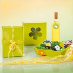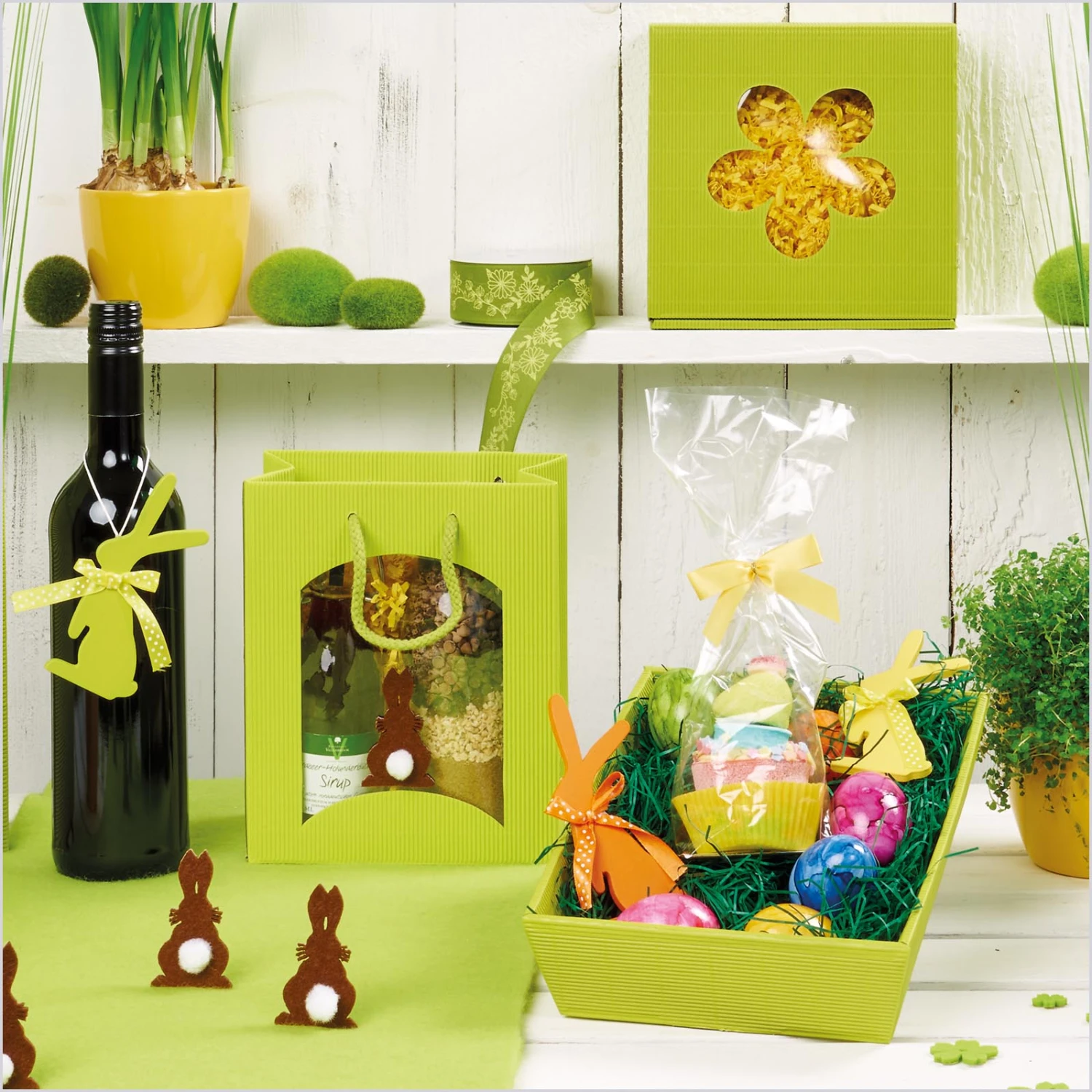 Dieser viereckige flache Geschenkkorb hat eine Oberfläche aus offener Welle Karton in der Farbe Limette. Die Innenseite ist in der gleichen Farbe wie die Außenseite. Die Geschenkkörbe werden flachliegend angeliefert und sparen somit viel Lagerplatz. Der Geschenkkorb aus Karton ist sehr schnell aufgebaut und eignet sich hervorragend zum Verpacken und Präsentieren der unterschiedlichsten Produkte. Zum Auspolstern und Schutz der Geschenke im Geschenkkorb eignet sich sehr gut Geschenkfülllmaterial wie PresentFill oder Holzwolle. Die Geschenkkörbe Modern sind viereckige Geschenkkörbe und in 9 verschiedenen Farben und bis zu 5 verschiedenen Ausführungen und Größen erhältlich. In Flach Mini und Flach Maxi. Außerdem in den Größen Klein, Mittel und Groß mit Griffen. Geschenkkorb Groß mit Griffen gibt es nur in den Farben Natur und Rot.