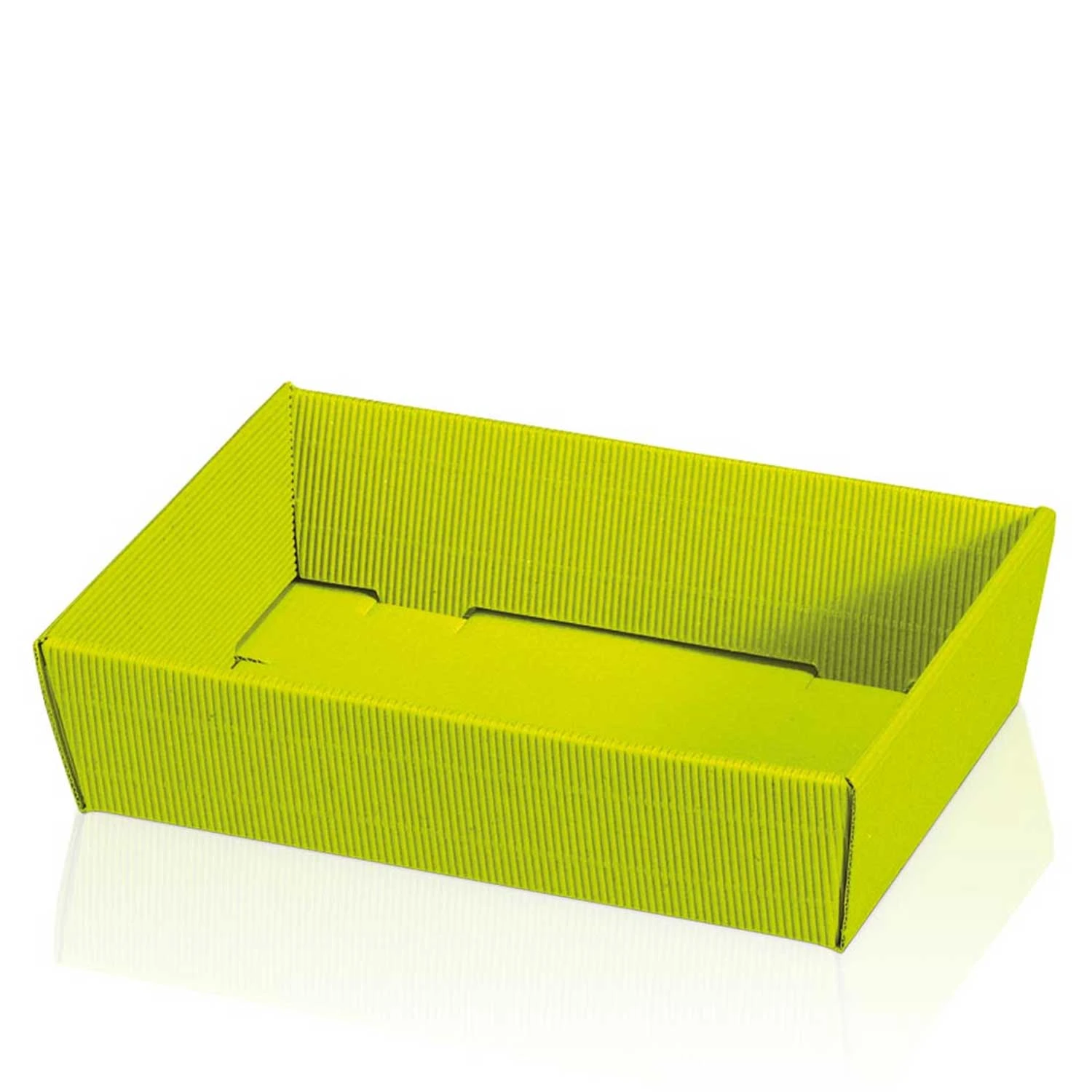 Viereckiger flacher Geschenkkorb aus offener Welle Karton in Limette Grün.