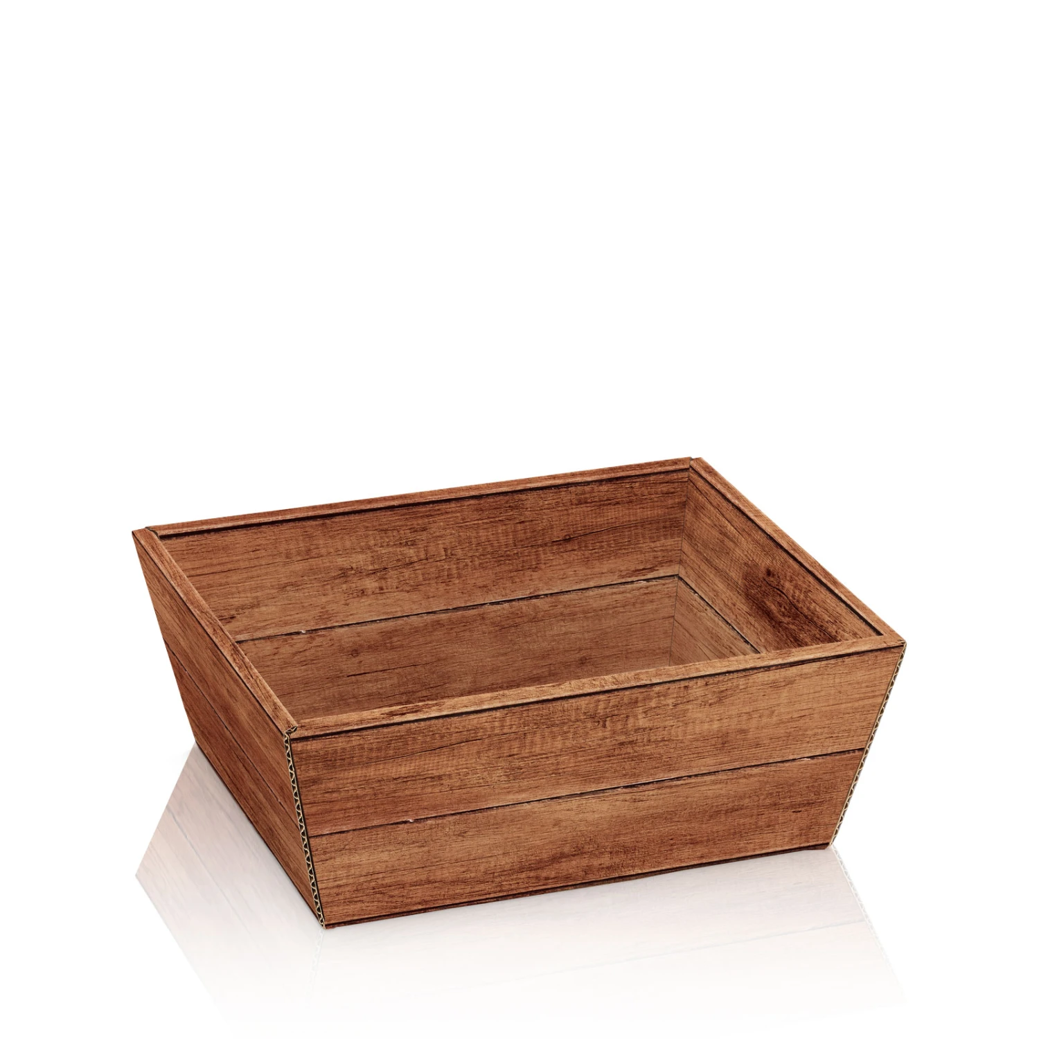 Kleiner viereckiger Präsentkorb aus Wellpappe Karton mit Designdruck in Holzoptik.