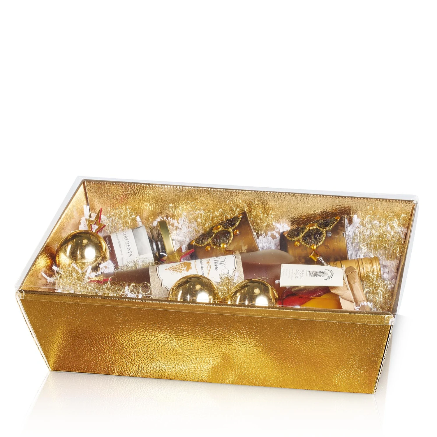 Viereckiger Präsentkorb in Gold-Metallic mit Strukturprägung.