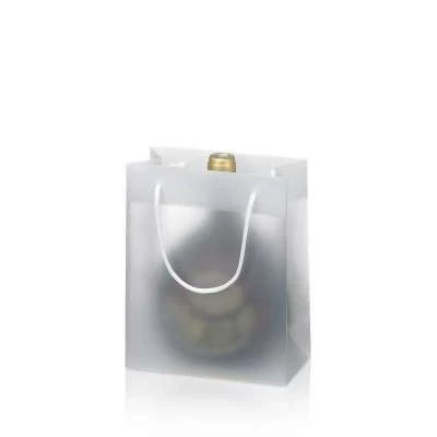 Geschenktasche für 1 Flasche Piccolo oder anderen Geschenkobjekten wie Delikatessen sind mit dieser transparenten Tragetasche leicht und schnell verpackt und werten jedes Geschenk auf. Die matte transparent Tragetüte erweckt Neugier auf den Inhalt und ist im Verkauf ebenfalls ein Hingucker.