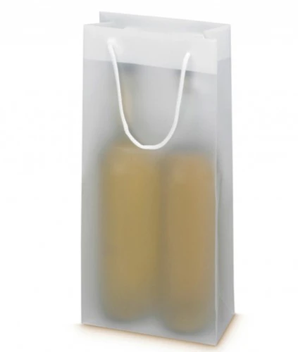 Geschenktasche für 2 Flaschen Wein oder anderen Geschenkobjekten wie Delikatessen sind mit dieser transparenten Tragetasche leicht und schnell verpackt und werten jedes Geschenk auf. Die matte transparent Tragetüte erweckt Neugier auf den Inhalt und ist im Verkauf ebenfalls ein Hingucker.